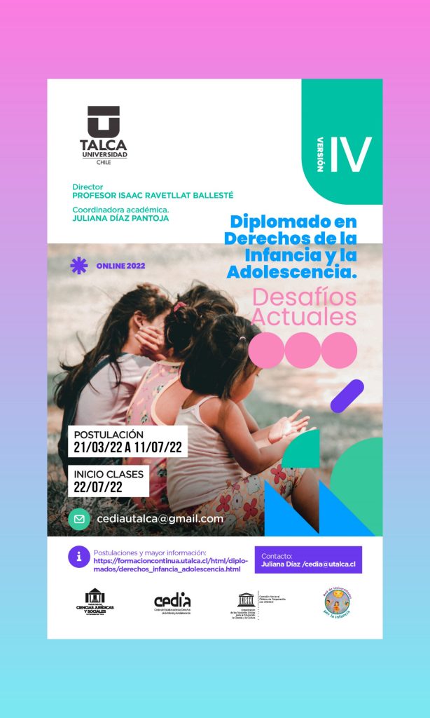 El CEDIA de la Facultad de Ciencias Jurídicas y Sociales Universidad de Talca, les invita a participar en la IV Versión (2022) del «Diplomado en Derechos de la Infancia y la Adolescencia. Desafíos actuales» que se realizará 100% online.